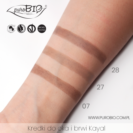 Kredka do oczu i brwi Kayal puroBIO jest miękka, niezwykle precyzyjna, łatwo rozprowadza się na oku. Ma bardzo dobrą pigmentację. Zintegrowana szczoteczka gwarantuje łatwe modelowanie i rozczesanie brwi i rzęs oraz równomierną aplikację koloru. Formuła zawiera cenne olejki roślinne i witaminę E, która jest naturalnym źródłem przeciwutleniaczy. Kredkę mogą stosować osoby o wrażliwych oczach i noszące soczewki kontaktowe.