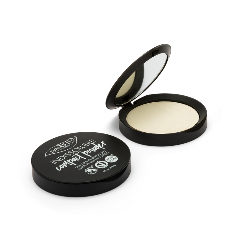 Puder kompaktowy to puder o aksamitnej strukturze i właściwościach matujących. Puder kompaktowy dzięki zawartości krzemionki i skrobi kukurydzianej absorbuje nadmiar sebum i wyrównuje koloryt skóry. Zawartość pudru ryżowego przedłuża trwałość makijażu. Puder kompaktowy puroBIO nie wysusza skóry, gdyż jest wzbogacony o organiczne oleje takie jak: makadamia, morelowy, avocado, karanja, z kolei masło shea łagodzi podrażnienia i wspomaga regenerację skóry.